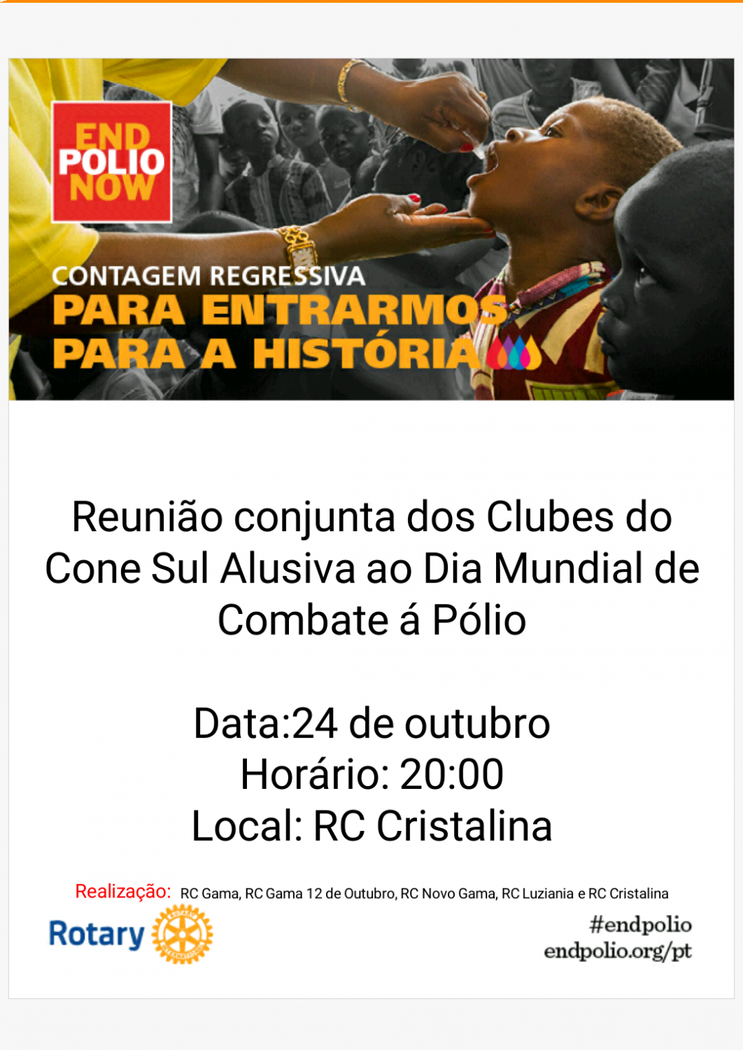 Os Rotary Clubs do  Cone Sul fará uma reunião conjunta no dia 24 de novembro em Cristalina o qual em uma das pautas a comemoração do dia mundial de combate à Polio. Conviamos todos os companheiros de todos os Clubs para participarem.