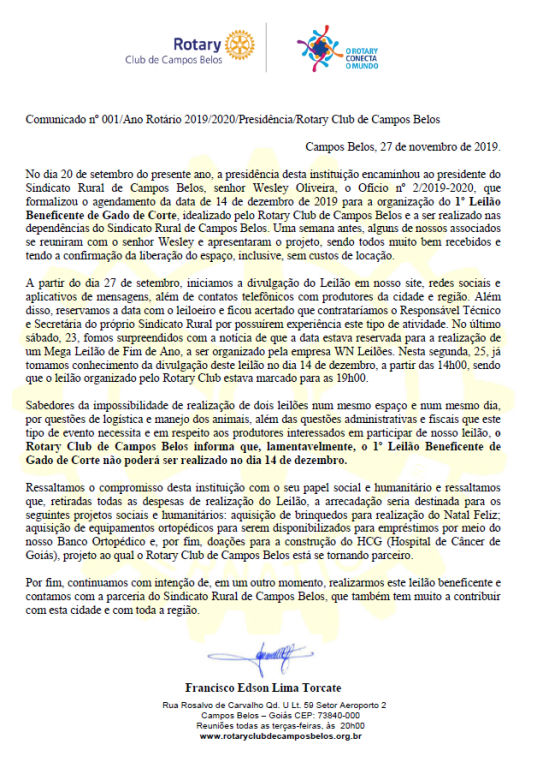 Comunicado nº 001/Ano Rotário 2019/2020/Presidência/Rotary Club de Campos Belos